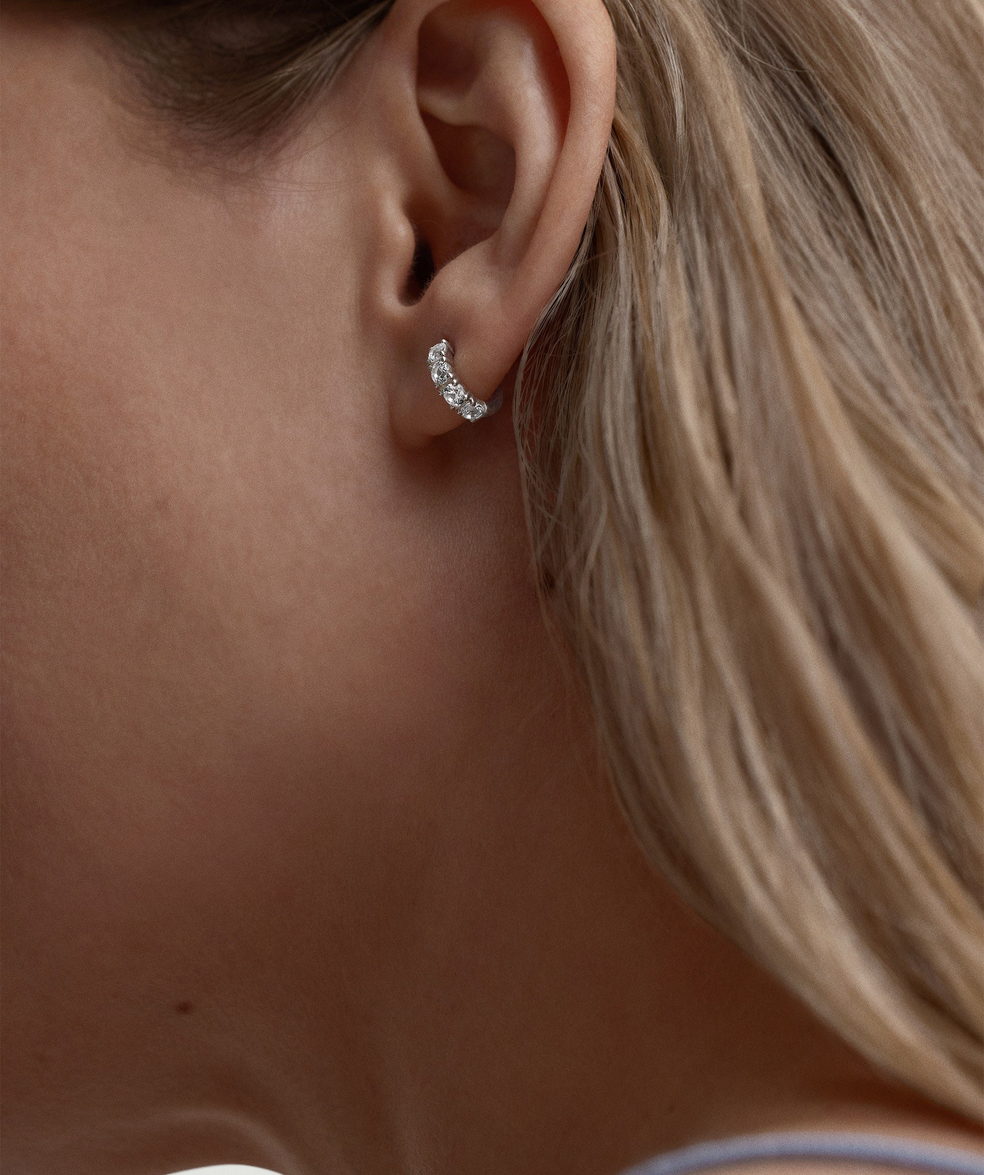 Dainty size, big impact. Lab grown round white sapphires perfect for everyday shine, in the most wearable 12mm hoop.