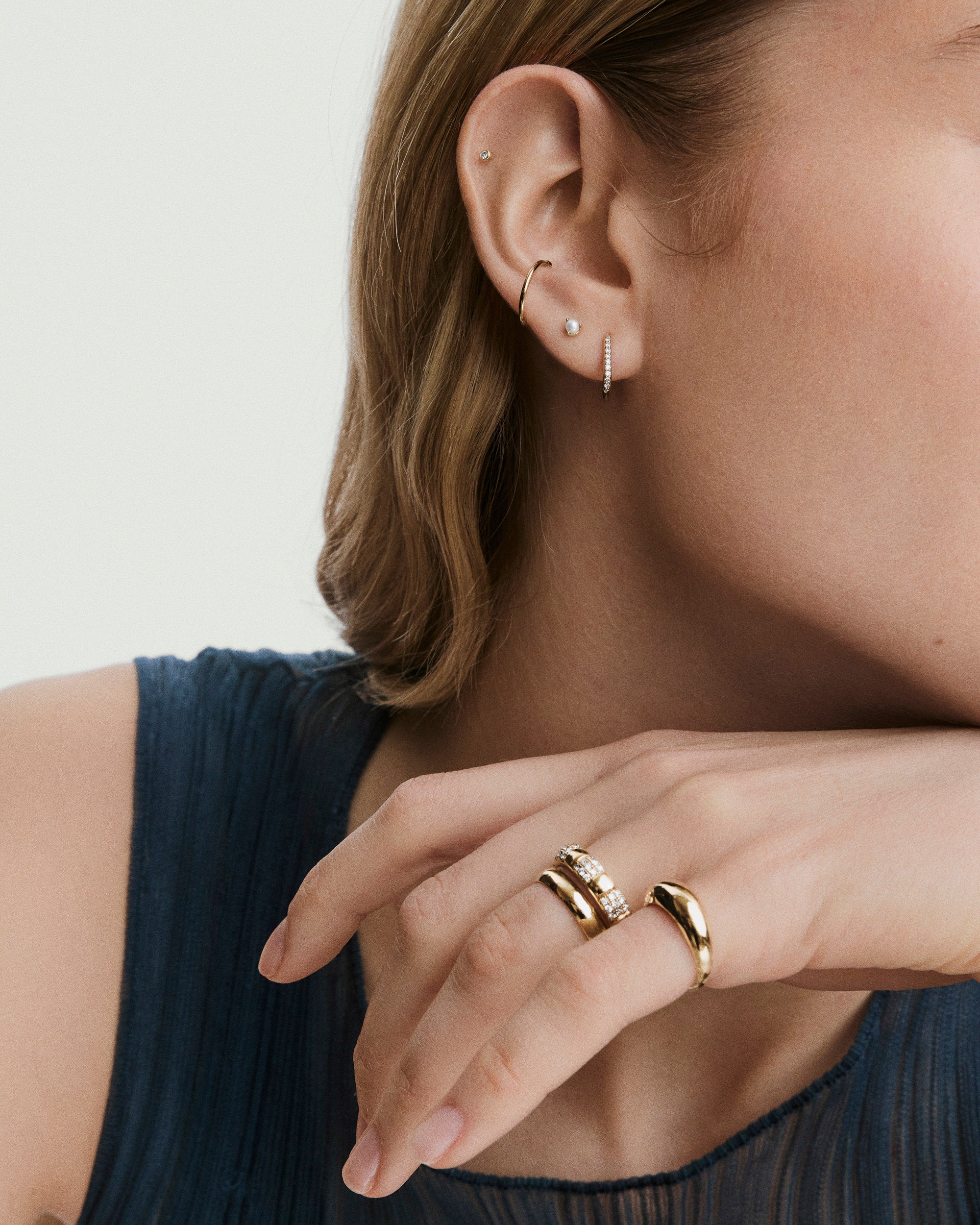 Our 14k gold pieces are made to last and perfect for everyday wear. Each piece is crafted from 94% recycled gold. 14k white gold pieces are finished with rhodium plating, giving them their signature color along with added shine and durability.