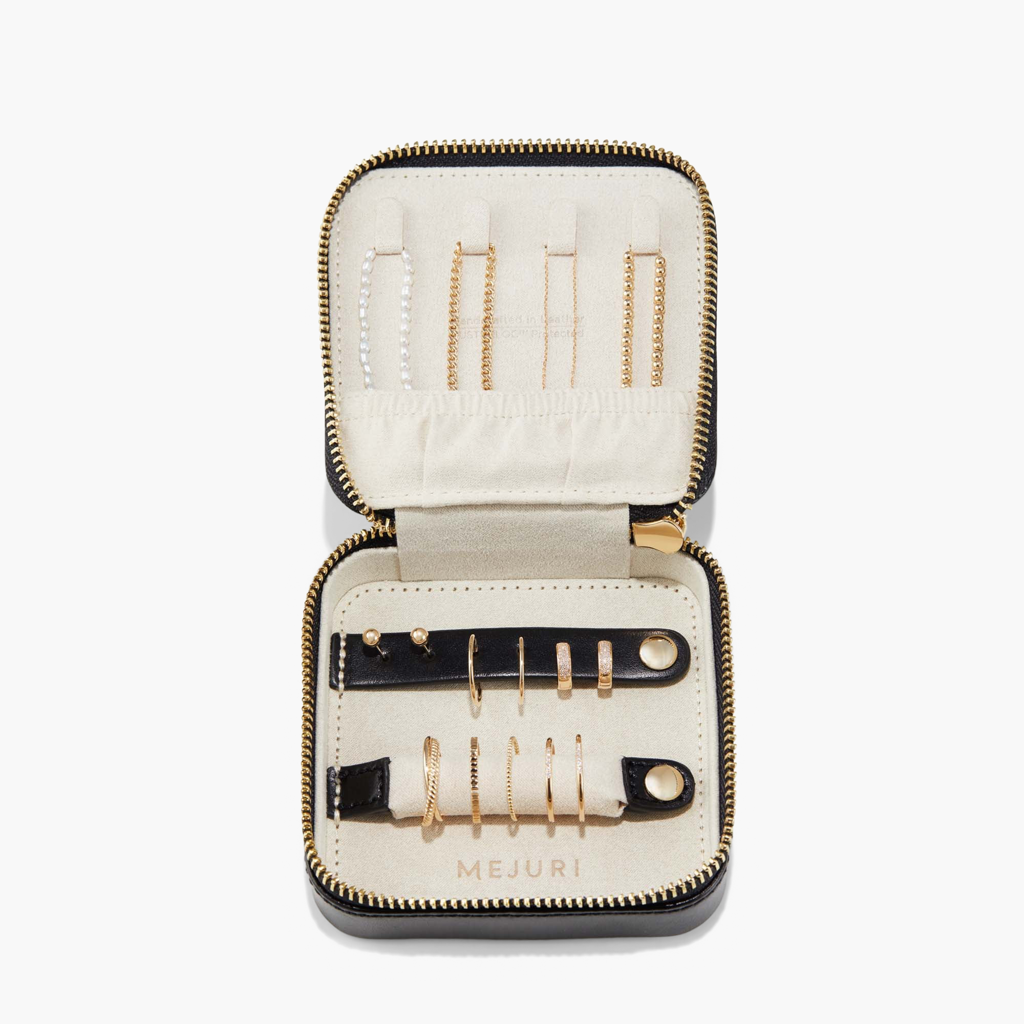 Made to move with you, the Black Jewelry Case is compact enough to fit in your purse or luggage. Handcrafted in grain leather, this case combines style and quality. Add a personal touch with monogramming. Shop now at Mejuri.