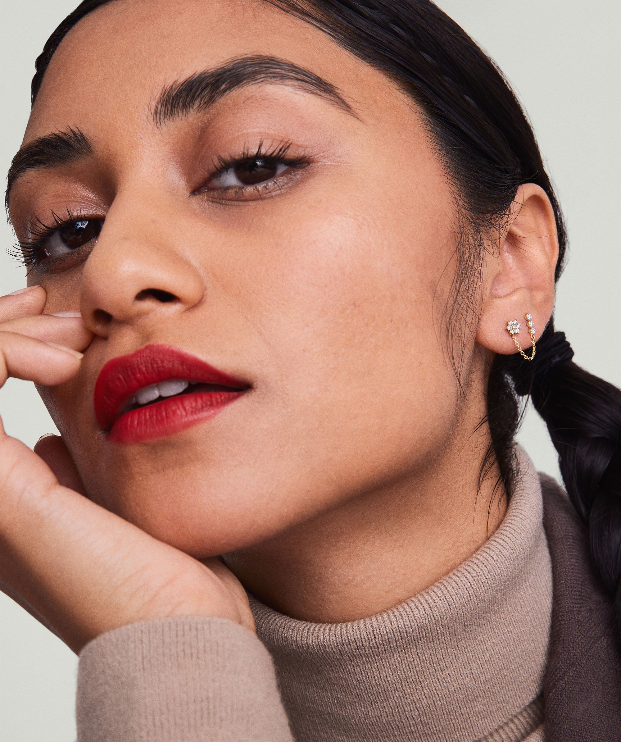 With this stud, you’re the artist—and it’s time to design your ear stack your way. Hook the chain onto an adjacent piercing or loop it front to back for a different look. The trio of gemstones add even more shine.